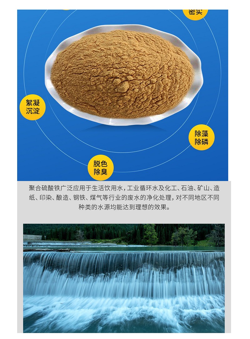聚合硫酸鐵鵬程很早熱賣的一種的凈水劑,使用至今,產(chǎn)量還不斷遞增。為了滿足多種行業(yè)廢水處理,又開發(fā)出除氨、氰化物及造紙廢水處理的不同要求的新型聚合硫酸鐵。使用時ph值適應范圍廣(ph4-11),生成的絮凝物比重大,沉降快,對去除水中的濁度(SS)、BOD、COD、色度、臭氣及部分金屬離子效果均很好,水中殘留鐵離子少,水解產(chǎn)物脫水性能好,泥餅含水率低等優(yōu)點,是一種高效的應用較廣的水處理劑。
